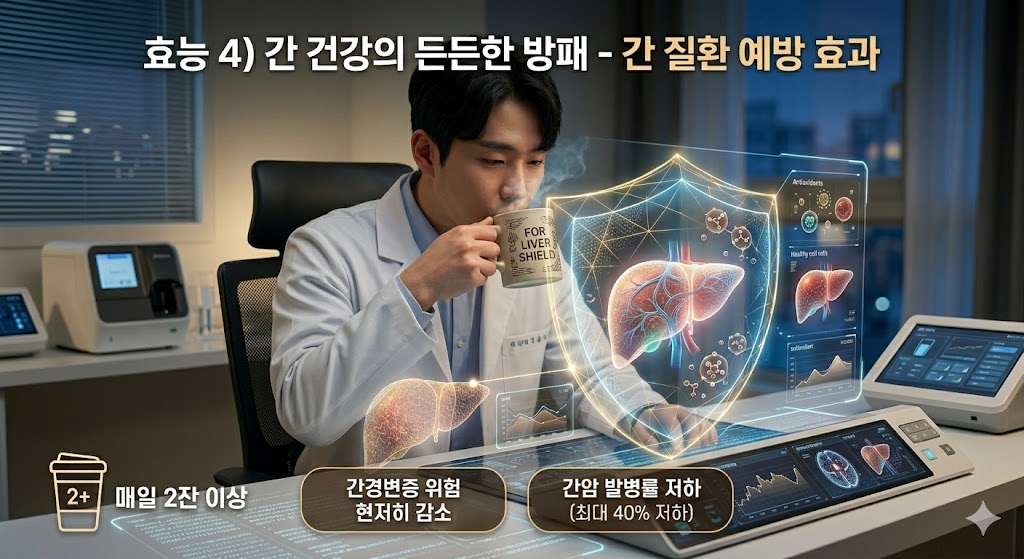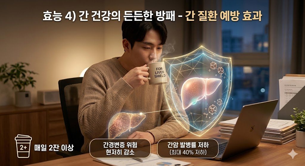 - 간암 발병률 저하: 간 세포를 보호하고 염증을 줄이는 커피의 성분 덕분에, 정기적인 커피 섭취가 간암 발생 위험을 최대 40% 가까이 낮춘다는 연구 결과들이 끊임없이 발표되고 있습니다. 음주와 야근에 시달리는 직장인들에게 커피는 생명수와도 같습니다.