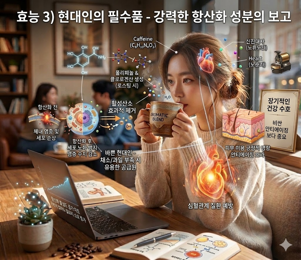 - 폴리페놀과 클로로겐산: 커피 생두를 로스팅하는 과정에서 생성되는 이 강력한 항산화 물질들은 우리 몸을 늙고 병들게 하는 주범인 '활성산소'를 효과적으로 제거합니다.