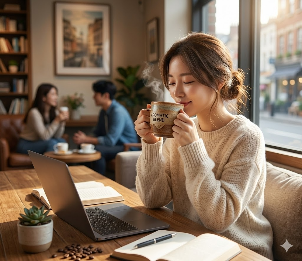 - 스트레스 완화: 로스팅된 원두에서 피어오르는 커피의 아로마(향기) 자체만으로도 뇌의 스트레스 수치를 낮추고 심리적인 안정을 가져다주는 아로마테라피 효과가 있습니다.