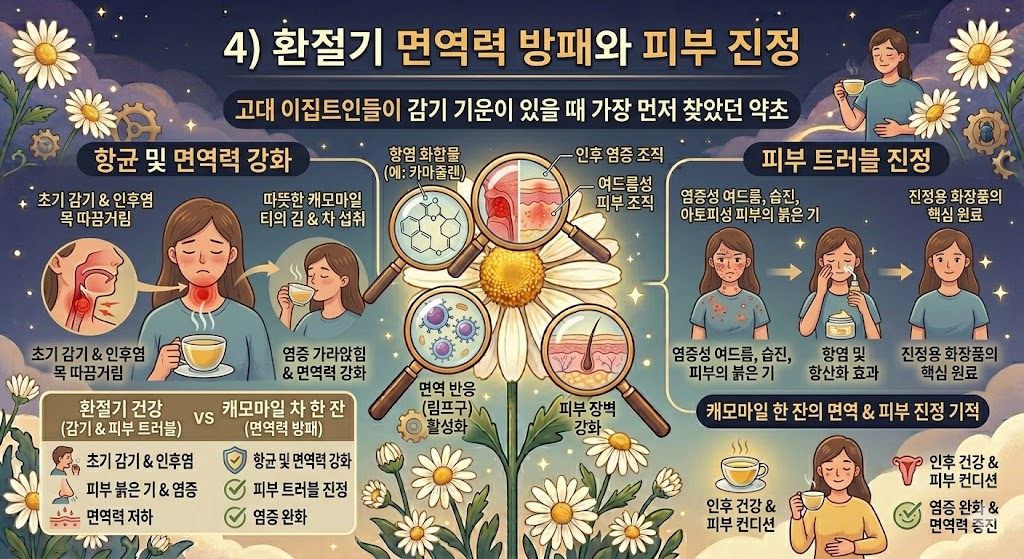 고대 이집트인들이 감기 기운이 있을 때 가장 먼저 찾았던 약초가 바로 캐모마일입니다.