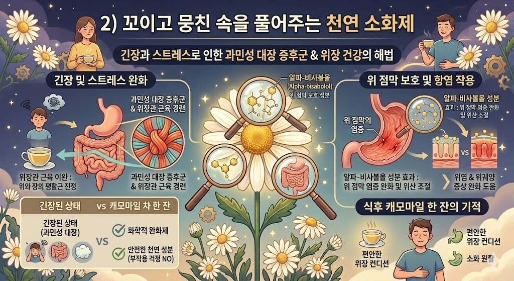 긴장하거나 스트레스를 받으면 습관적으로 배가 살살 아프고 소화가 안 되는 '과민성 대장 증후군'을 앓고 계신다면, 식후 캐모마일 한 잔이 훌륭한 해결책이 될 수 있습니다.